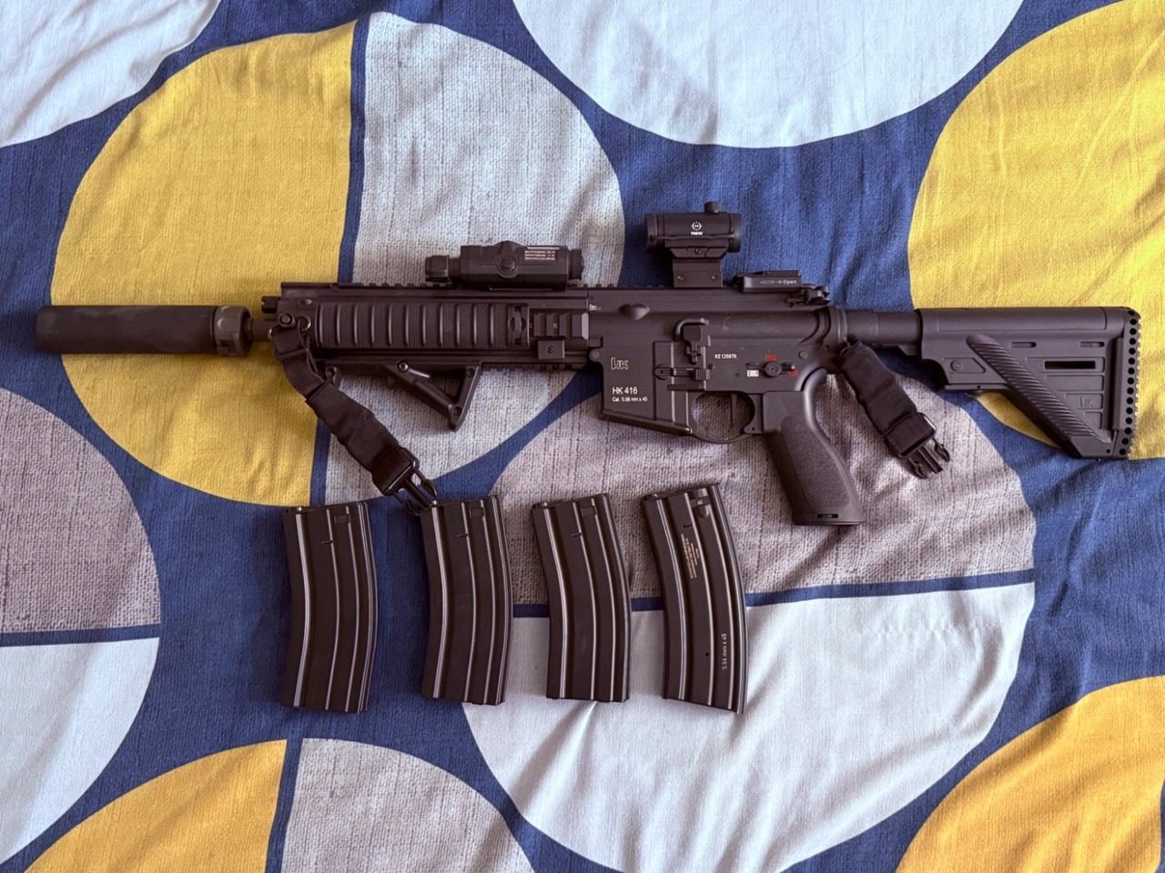 Je vends ma HK 416 A5 de marque VFC, équiper avec une poignée inclinée, un viseur point rouge et un silencieux pour l’esthétique, l’interne a été modifié, il y a un moteur hi-torque ainsi qu’un aster Gate l’équivalent d’un titan Gate, canon et le joint ont étaient changé, il y a également un mosfet.