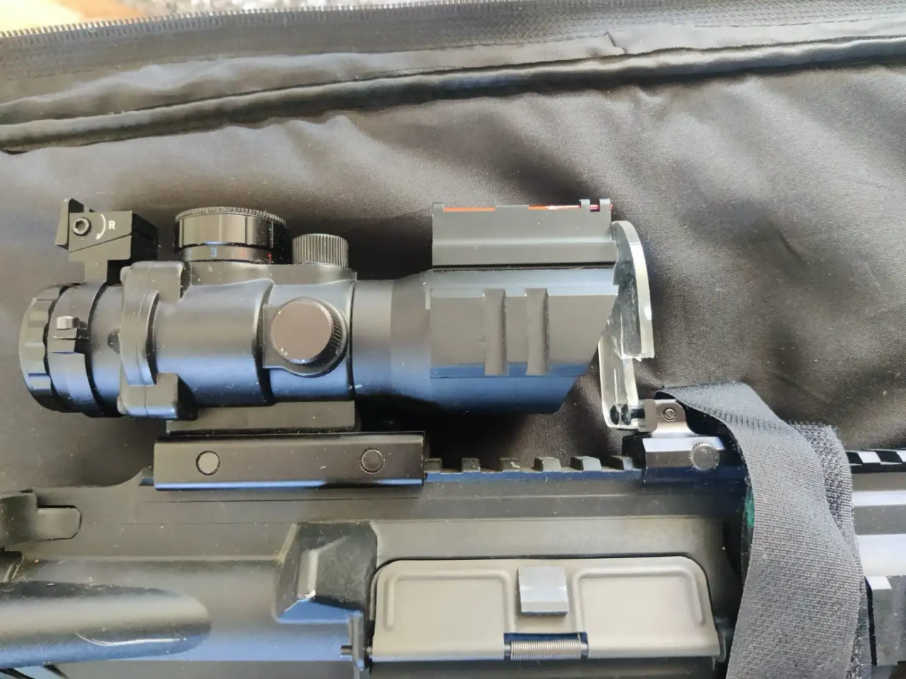 - sa lunettes de visée (ACOG 4x32, réticule rétroéclairée + fibre optique)