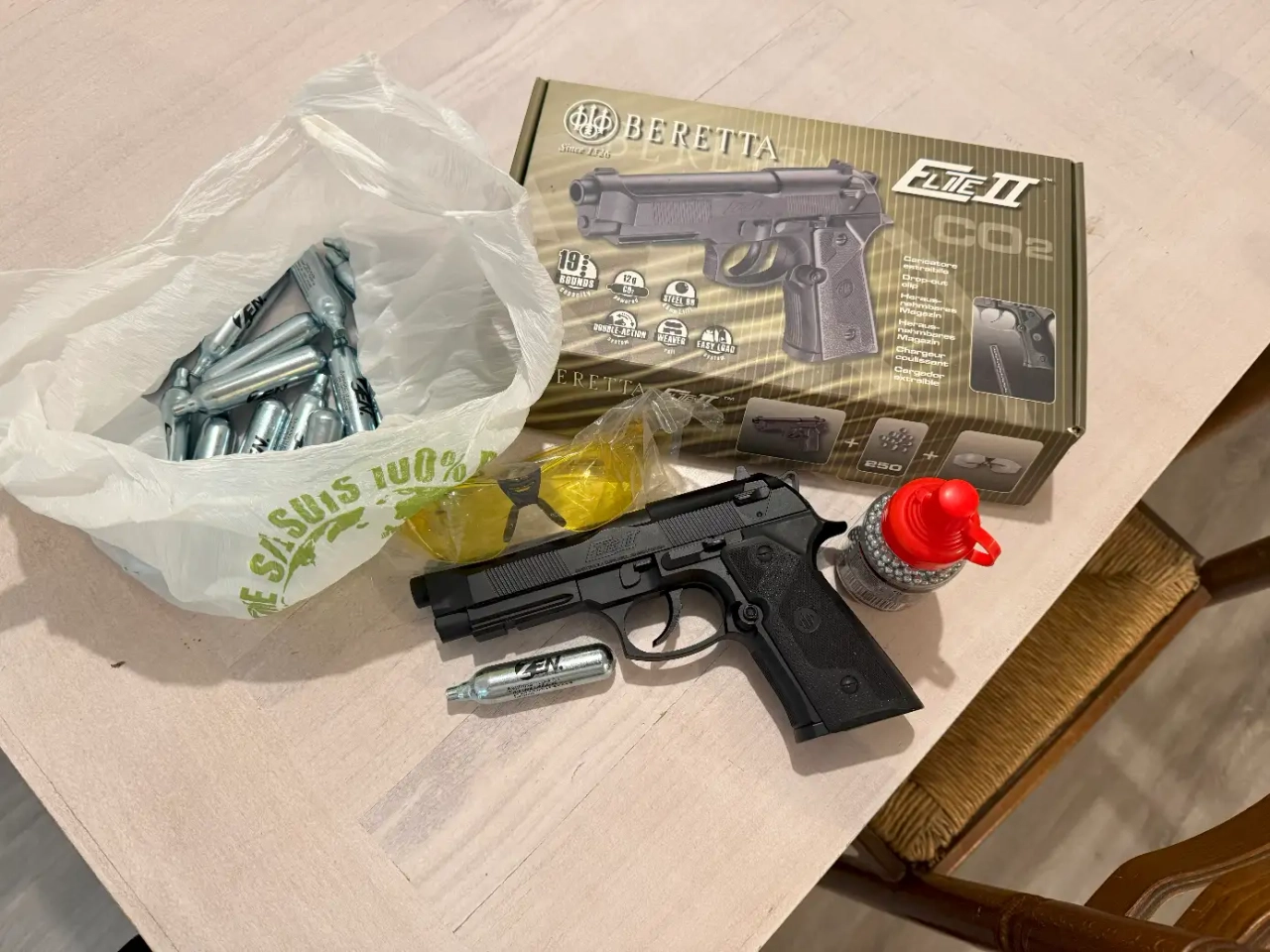 Bonjour à vendre pack complet beretta Elitte 2 avec 21 capsules de CO2 et un biberon de bille steel BB.