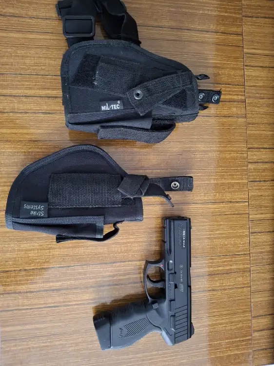Co2 avec plusieurs cartouches + un holster de cuisse + un holster de ceinture.