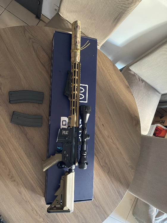 J’ai un chargeur hi-capa avec et une batterie mais elle n’a pas servis depuis longtemps. Je la vend aussi avec le silencieux et la lunette
