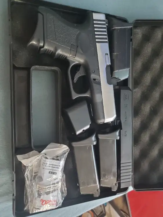 Glock 26 kwc bon état avec culasse chrome, culasse noir en plastique et 3 chargeur supplémentaire y a un nozzle supplémentaire et un talon de chargeur pour glock mais trop grand pour le g26