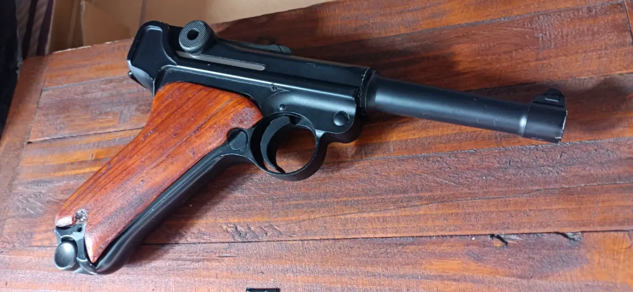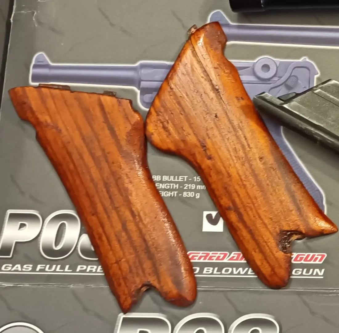 Paire de poignée en vrai bois réel pour réplique d'airsoft Luger P08 de chez We-Tech, certainement compatible avec celles de KWC
