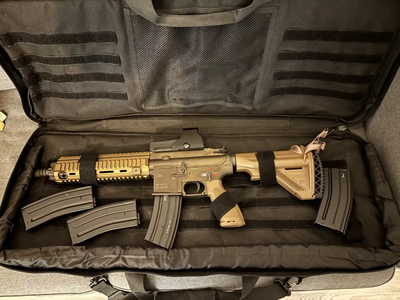 Réplique H&K 416 CQB Tan VFC UMAREX AEG et son chargeur d'origine + 3 chargeur 300 billes VFC Umarex + le viseur holo + le sac de transport.