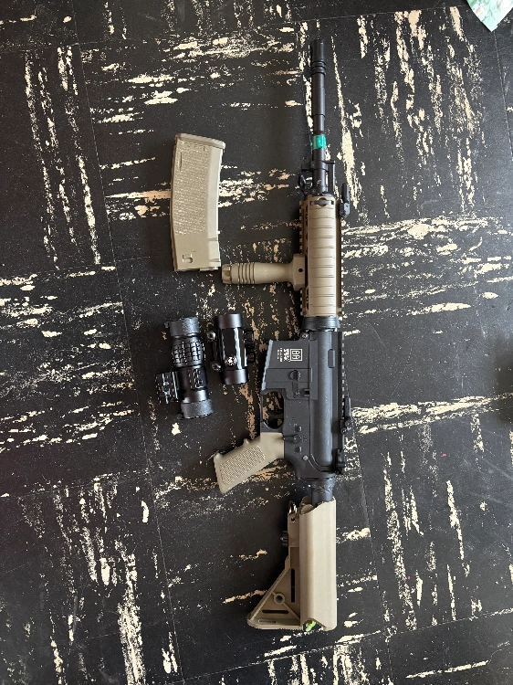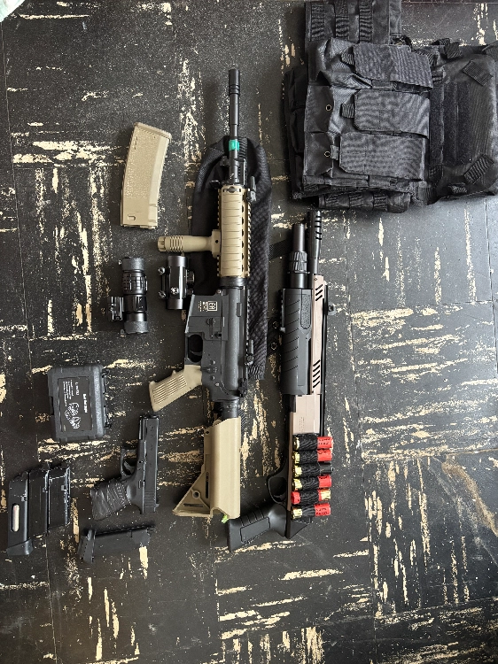 Vend gilet tactique + fusil à pompe à ressort semi-automatique de trois billes + glock 19 de chez cybergun avec un canon de précision un red dot un holster 1 chargeur fonctionnelle et 3 chargeur avec problème de joint + Réplique M4 LT-04 GEN2 specna armsAEG avec un chargeur hi cap 350 billes une poignée avant tactique un viseur point rouge/vert