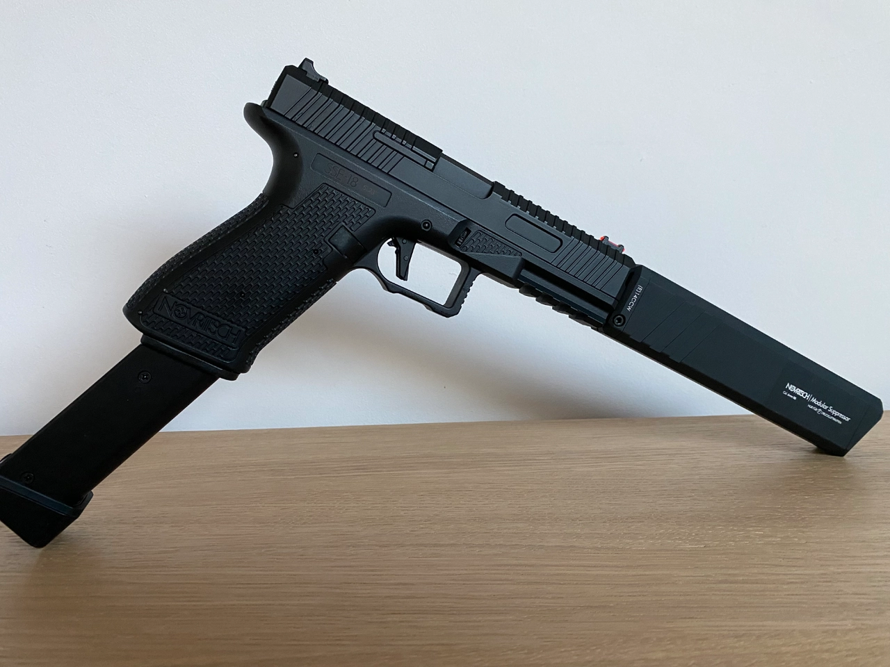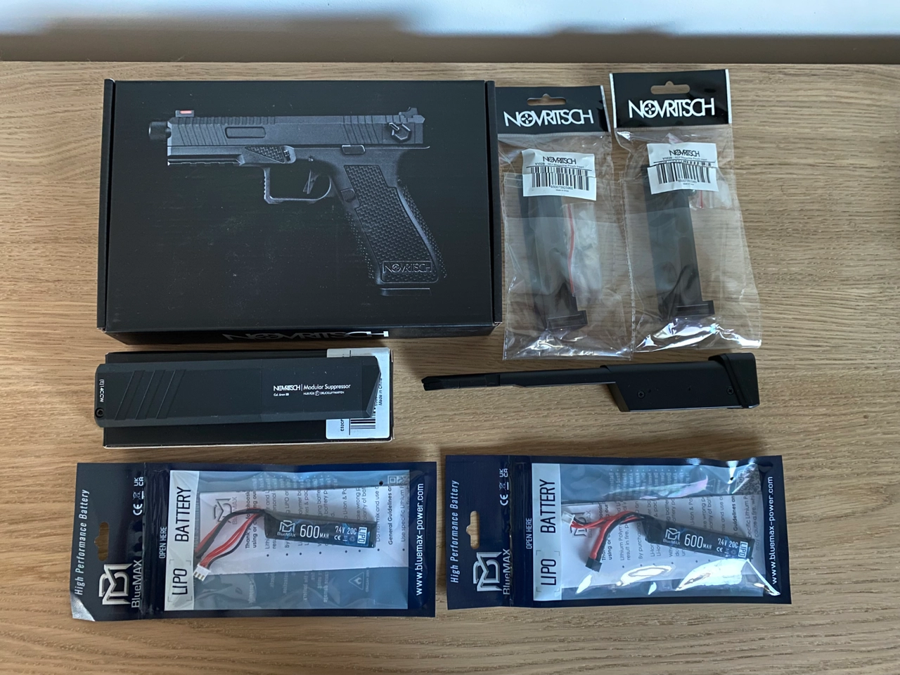Je le vend avec tous les accessoires sur les photos (silencieux Novritsch, 2 portes-chargeurs SSE18 Novritsch, 2 batteries, un support de viseur SSE18, 3 chargeurs d’origine et 1 chargeur long 100 billes).