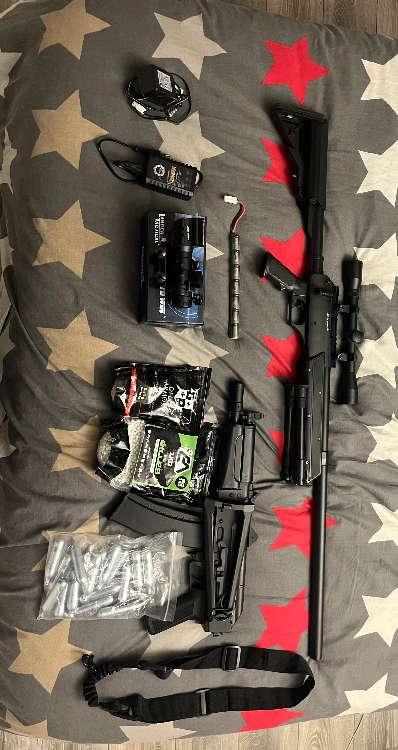 Bonjour, je vends mon lot d’air Airsoft avec chargeur pour l ak en AEG deux batteries aeg la réplique a une crosse pliable je donne avec un viseur à plus de 150 €. Mon sniper Spring est des billes alourdi. En l’occurrence, tout ce qu’il y a sur la photo.
