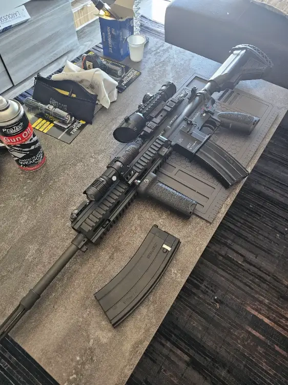 Full métal, un blowback percutant, utilisé les mêmes chargeurs que les Hk416. En fait, c'est ni plus, ni moins un Hk416 version longue.