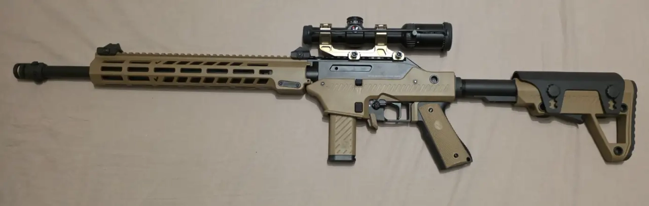 Vendu dans sa boite d’origine avec son chargeur court, une lunette 1-4x20 Vector Optics, le patch fourni avec, les 2 nozzles d'origine ainsi qu’un nozzle rose 450 fps qui est déjà monter sur la réplique.