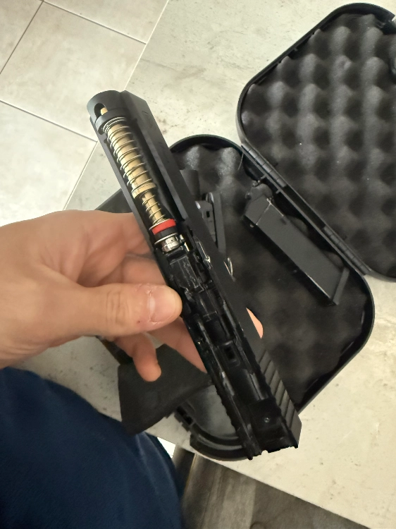 Modification il y as la détente c’est une agency arms, un ressort de rapelle gun modify (plus de recul) joint hop up et canon interne mapple leaf. Sera vendu aussi dans sa malette glock ainsi que ses pièces d’origine.