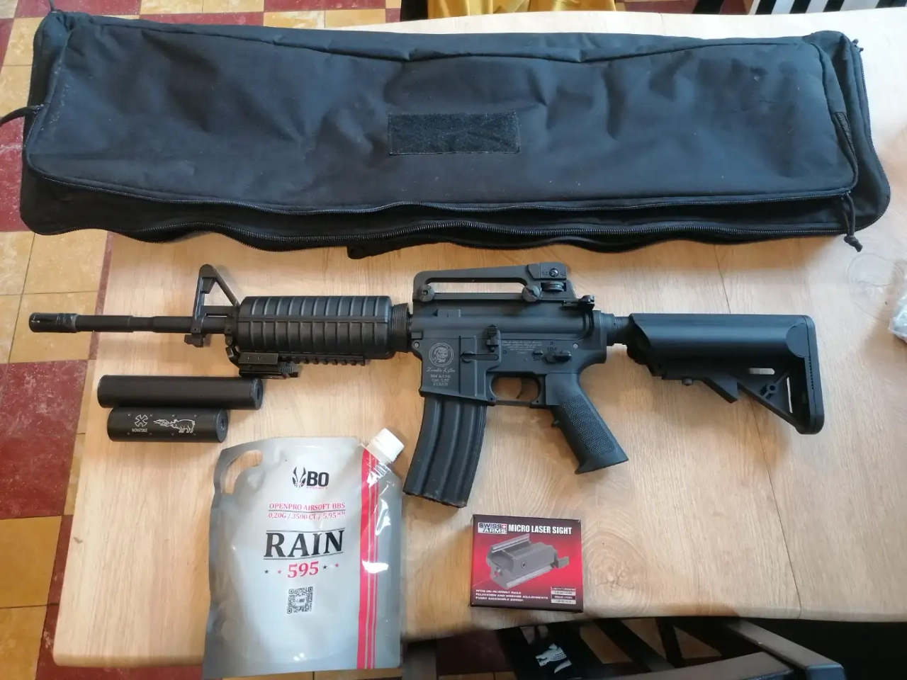 A vendre M4 zombie killer avec laser swiss arms, billes 0.20, 2 silencieux et sacoche de transport. Sûrement prévoir une batterie. Seulement fait le rodage. Jamais utilisé en partie.