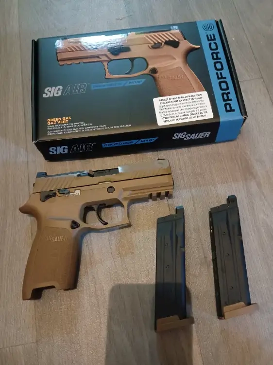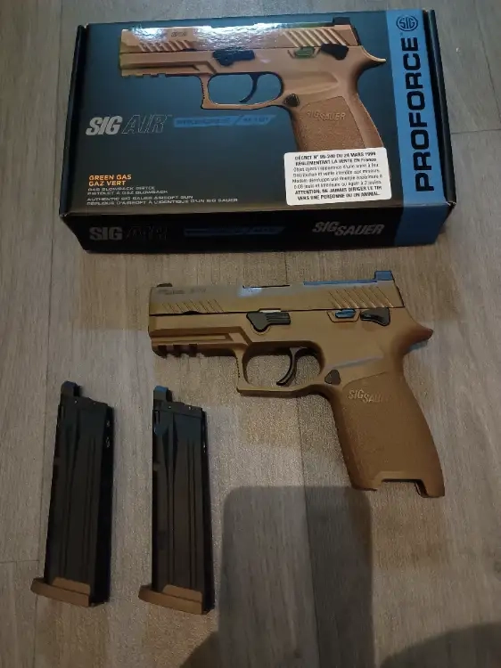 Sig proforce P320 M18, couleur Tan, joint mapple leaf, tout fonctionne parfaitement, aucune fuite.