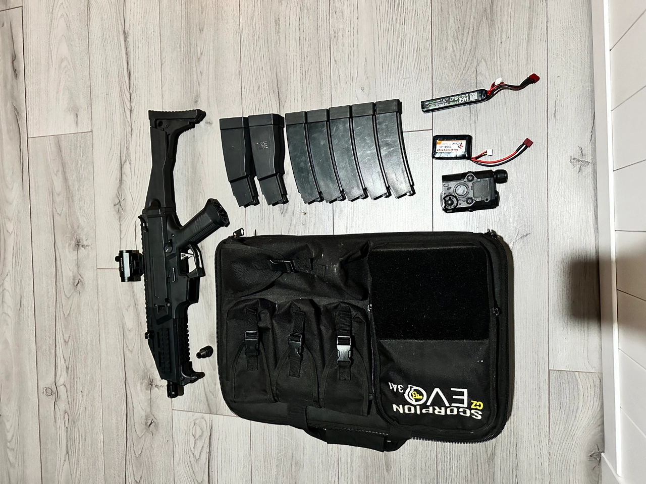 Vend cz scorpion evo 3 tres bon etat (400€) avec detente cnc (40€), red dot (20€), 5 chargeurs mid cap ( 125€), 2 chargeur hi cap (75€) avec batterie, anpeq factice pour la grosse batterie et ressort pour cqb