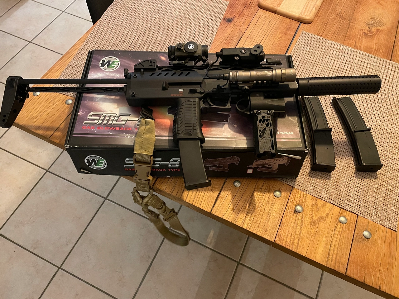 Avec 3 chargeurs, red hot, anpeq +lampe avec switch deporté, mini lance grenade hfc, poignée tactique et sangle