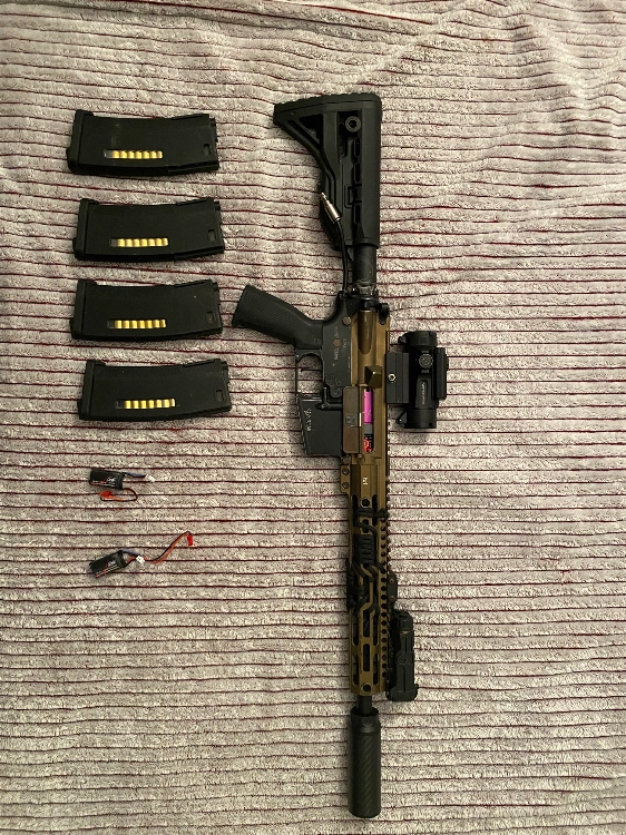 Accessoires : viseurs vectoroptics , boîtier peq (uniquement lampe ) avec switch deportés, un silencieux silverback, une poignée pistolets pts , une crosse east crane, 4 chargeur pts et 2 batterie lipo 7,4v