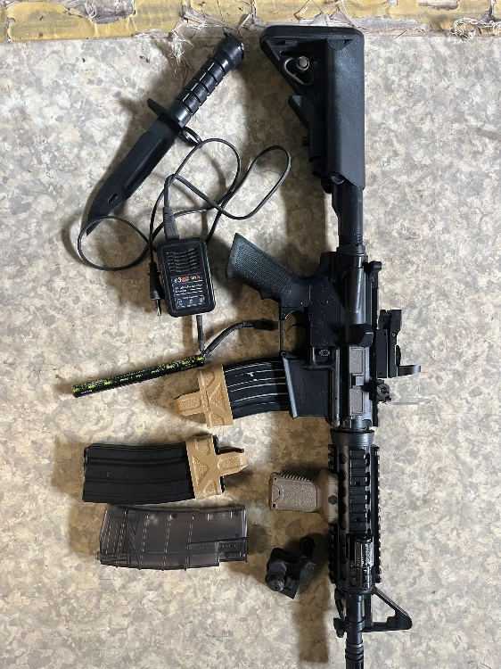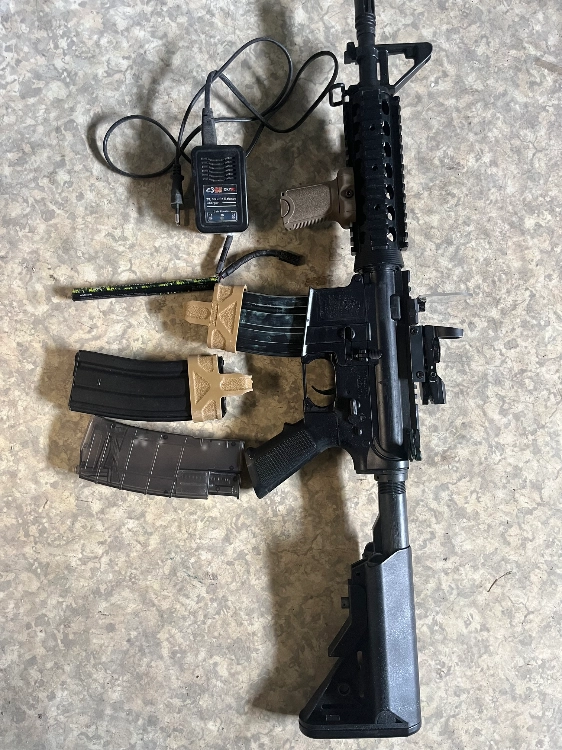Il y a dessus un canon, une mire, une poignée avant, deux chargeurs, une batterie lithium ainsi que le chargeur.