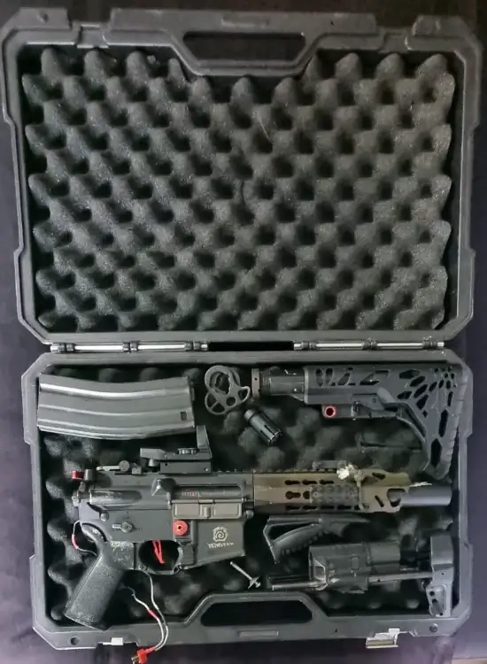 La crosse d'origine est fournie, un tube de crosse m4 ainsi qu'une crosse m4 on été mis dessus (démonté pour la ranger dans sa mallette) donc 2 configs sont possibles.