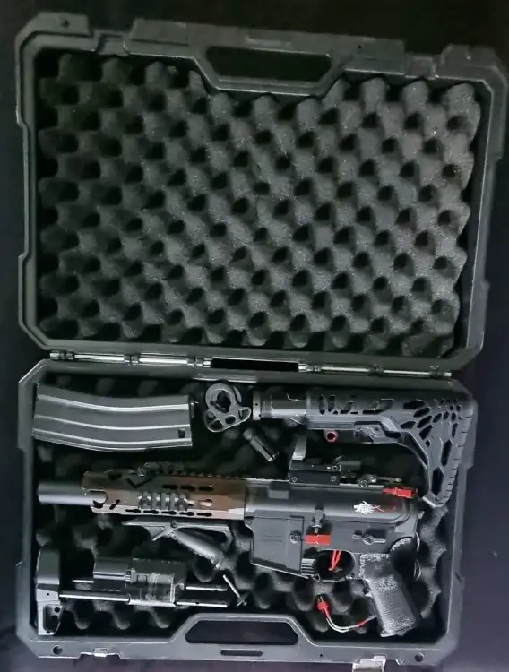 Réplique équipé d'une poignée angulaire, d'un viseur point rouge et d'une poignée grip type pts