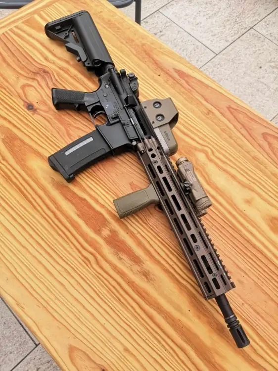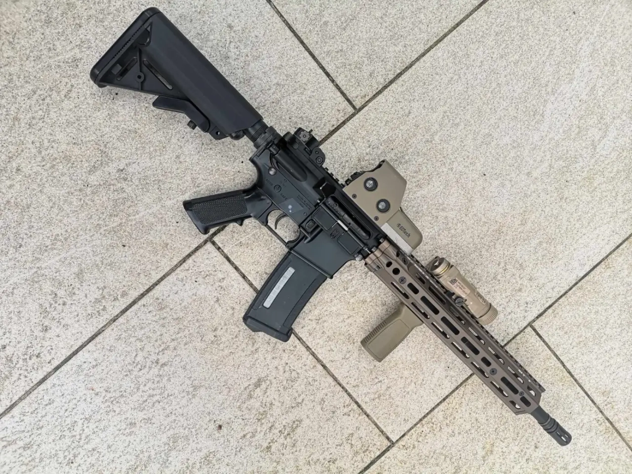 M4 totalement fonctionnelle. Upgrade complète de chez OPS STORE (liste dispo via SMS) + bloc hop up marui renforcé (les derniers avec inserts laiton à l'intérieur) + canon 6.02 guarder + joint upgrade avec appuie plus large. La réactivité et les performances sont justes top.