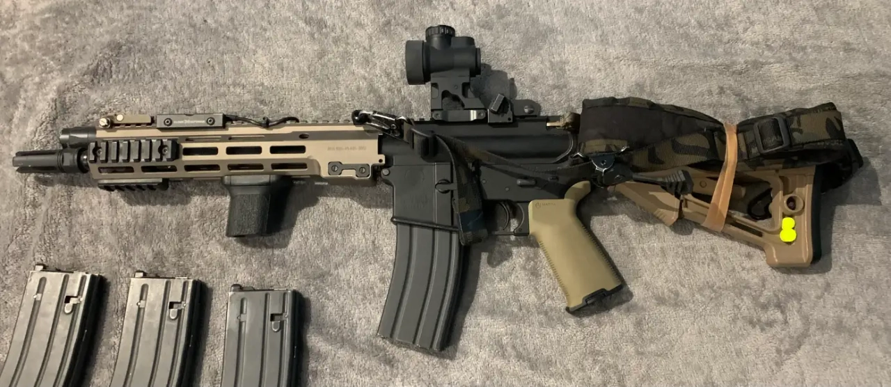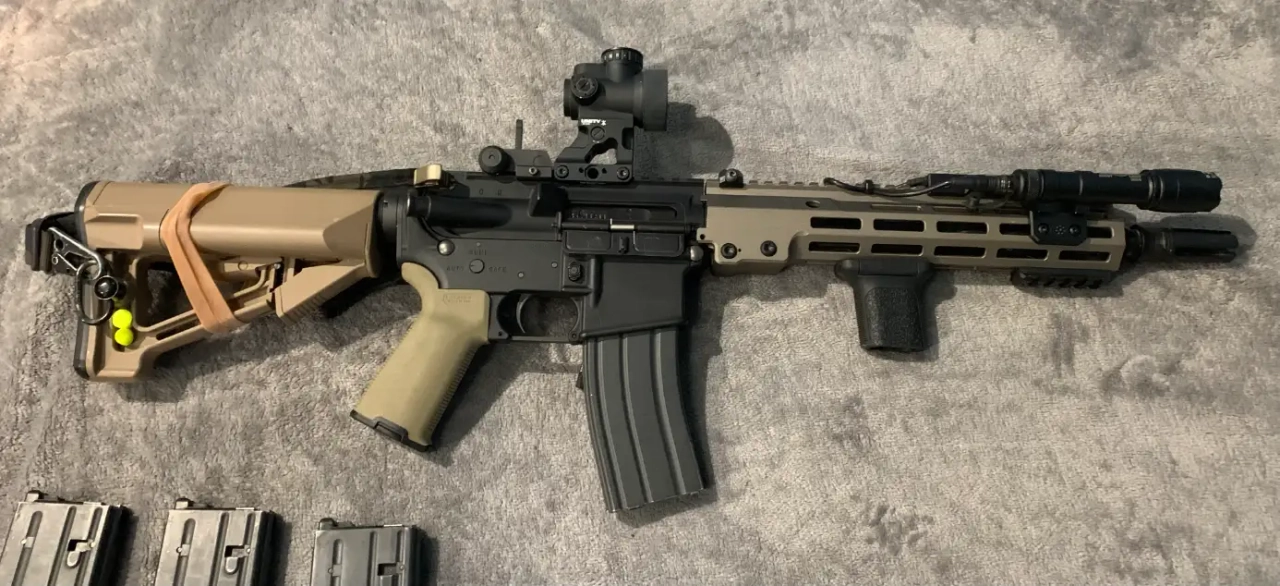 -Tous les accessoires sur la photo SAUF la sangle (poignée Magpul TAN/ 30€, red dot Holy Warrior SRO avec son mount/100€, lampe et son mount/40€, poignée avant etc...)