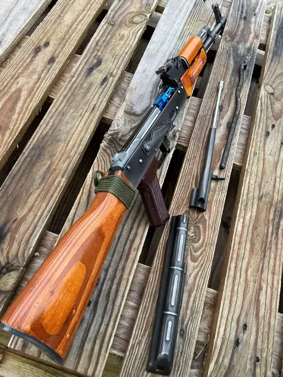 Vends une AKM AEG kit INOKATSU bois et acier avec 8 chargeurs lowcap 120 coups, 4 en métal et 4 en polymère aspect bakélite.