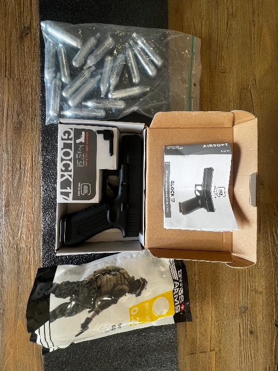 Je vends la boîte d’origine, le GLOCK et son chargeur d’origine, la clé pour insérer les sparclettes de CO2, un sachet de 16 sparclettes de CO2 et un sachet de billes 6mm Swiss Arms de 600g environ.