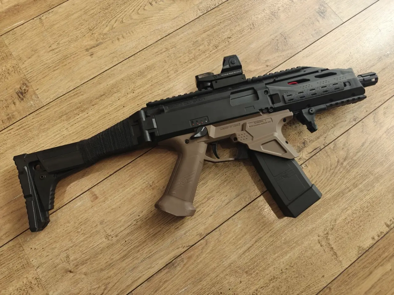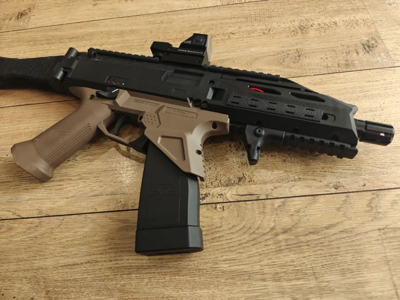 Je vends une réplique ASG Scorpion EVO A.C.E équipée du kit ATEK et accompagnée d'un chargeur 370 billes.