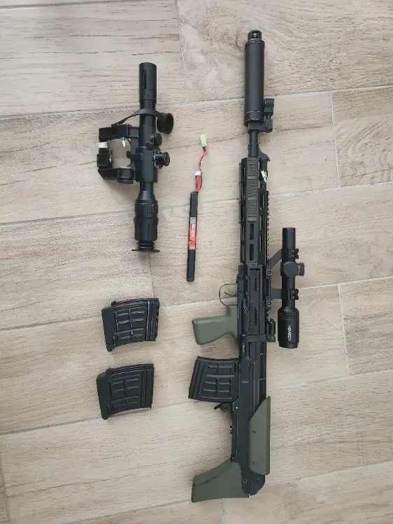 Elle est vendu avec sa boite d'origine avec 2 chargeurs mid cap metal de 100 billes et un chargeur high cap metal, une lunette style pso 1 matrix (140€ neuf) dont le rétroéclairage ne fonctionne plus et une seconde lunette LPVO à zoom variable de chez Novritsch (100€ neuf) ainsi que 9 couvre rails mlok et une batterie 11.1v 1200 mAh ATM.