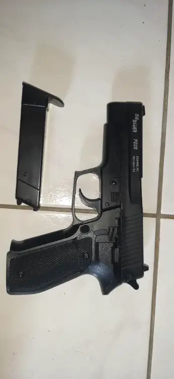Je vends mon réplique de poing Sig Sauer P226, son chargeur il marche sans gaz, ni, CO2, ni batterie par puissance : 0.6j Maxi. j’offre le sac de bille compris avec le réplique.