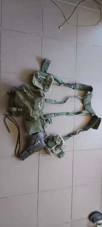 Brêlage américain du Vietnam, avec 2 portes chargeurs AR, un holster en cuire pour PA M1911, une gourde dans sa housse, une musette et un porte chargeur pour chargeur 9mm long (Thompson et autre) : 40€