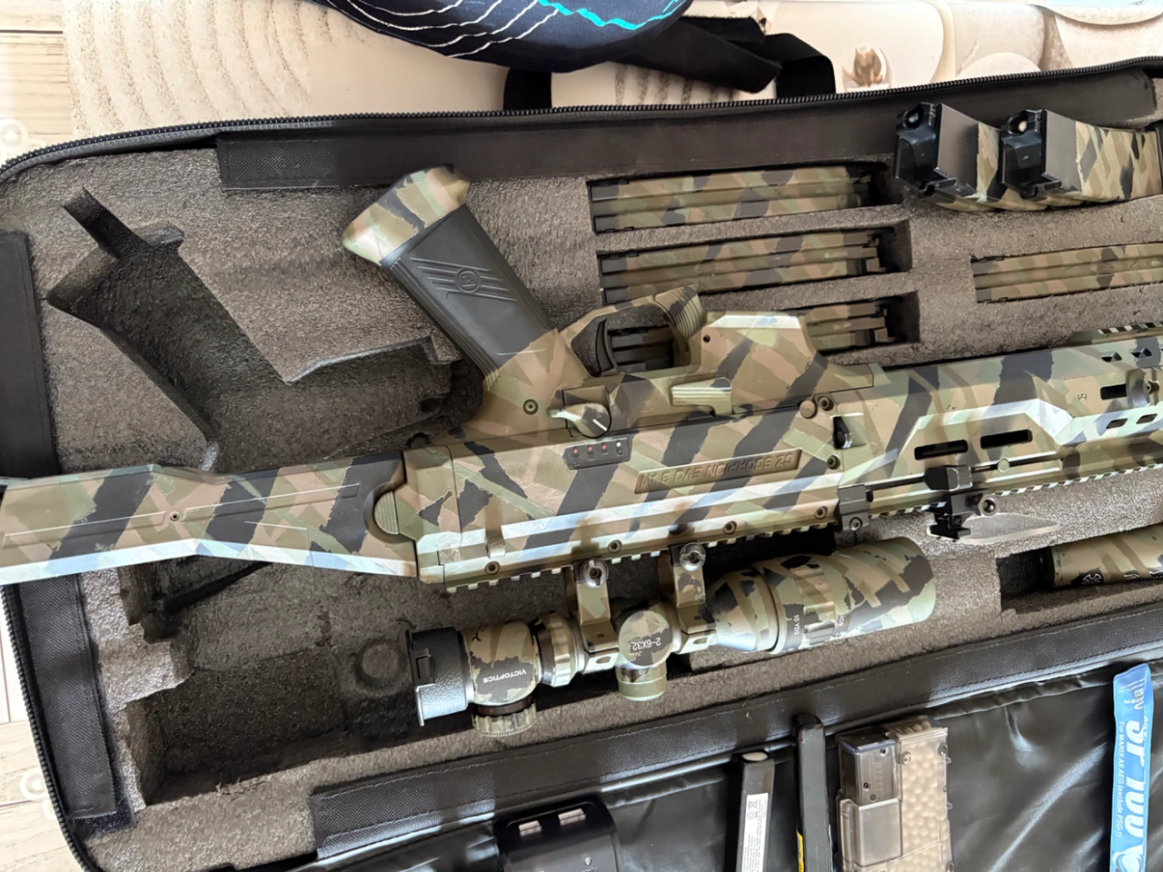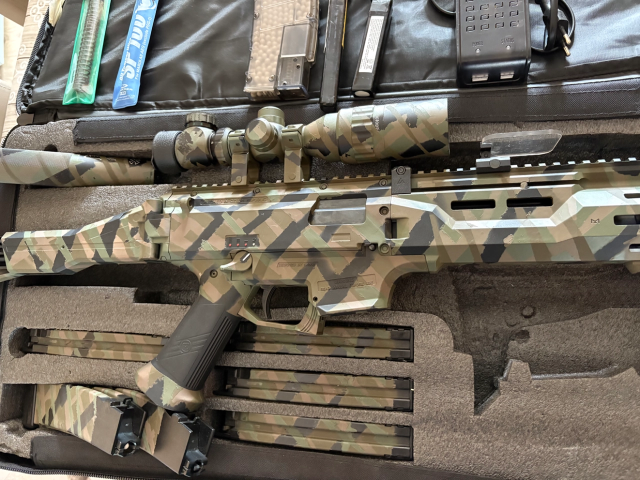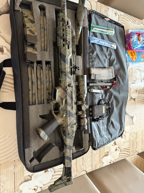 Vend scorpion evo carbine de 2021, 3 mode de tir, vendu avec sacoche scorpion, 6 chargeur 75 coups, loader, 2 ressort 100 et 120, lunette 2-6x32 avec protège viseur, silencieux, guide ressort renforcé, anti chute du ressort de rappel, 2 batterie 1100 et 1200
