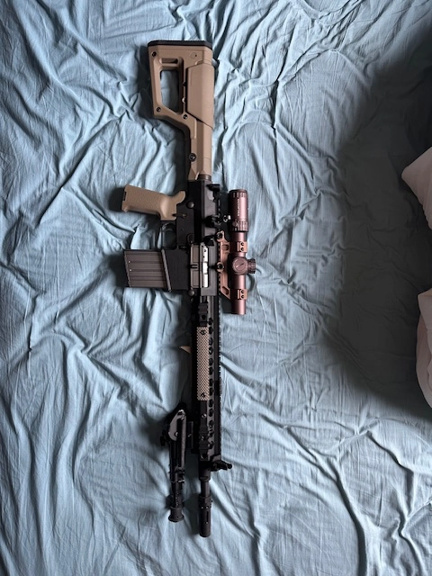 Lunette, crosse magpul RS, poignée magpul, bipied type Harris, rail URX.
