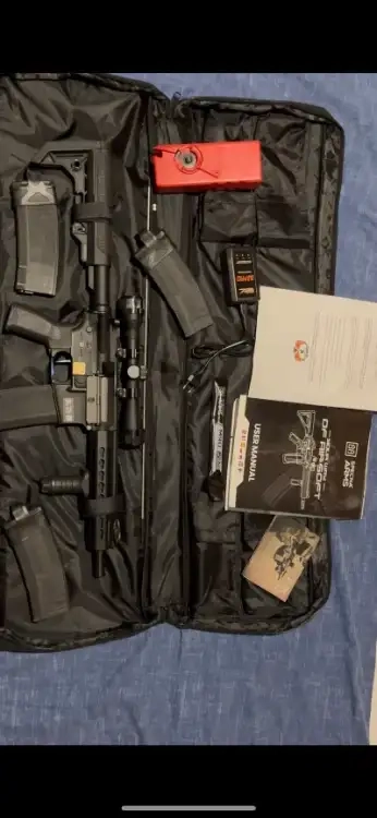 Bonjour je vend ma réplique M4 DMR ( gearbox V2 ops , chambre hop-up m4(gen2 ) SHS , Switch assembly V2 Dean Slong ) équipé d'une lunette X4 de deux chargeur specna arms130 coups et de deux autres chargeurs Novritsch 220 coups