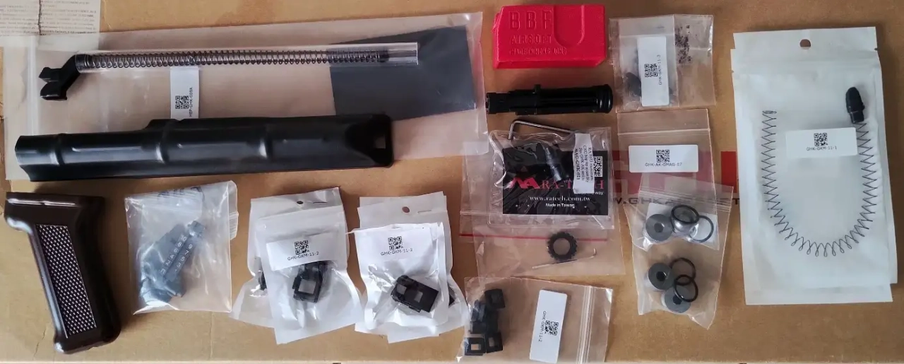 Pièces d'origines fournies (sauf le sear autofire et la queue de détente d'origine qui étaient cassés). Pièces de remplacements comprises dans le lot : ressort et poussoir pour chargeur x2, jeu de bouchons de contenant à gaz x2, bras d'arrêt de fin de tir x2, lot de gaz route, lèvres de chargeurs neuves (a voir en fonction du nombre de chargeurs voulu).