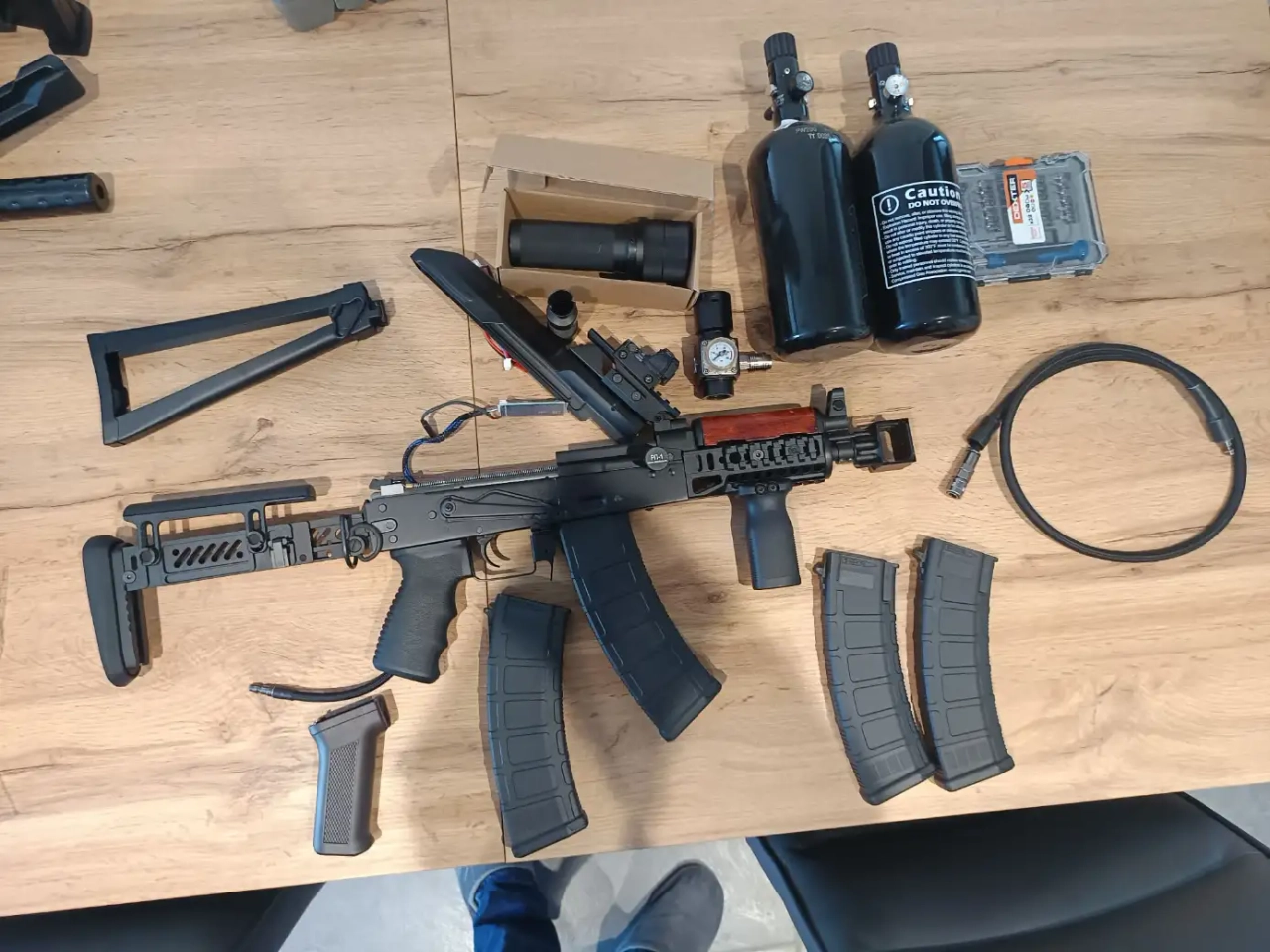 Ak74su cyma custom zentico avec à l'intérieur une gearbox polar f2 montée par un pro, fonctionne au top! Fournie avec tous les accessoires sur les photos (sauf red dot) en interne il y a un canon maple leaf en 250 mm un joint hop up maple leaf silicone 50°accessoires d'origine fournis ! Fourni avec 4 chargeurs MAG 30 ou 140 coups, le cache flamme zentico, un silencieux psb1 mini, et en option le kit HPA avec régul balystik deux bouteilles + flexible US!