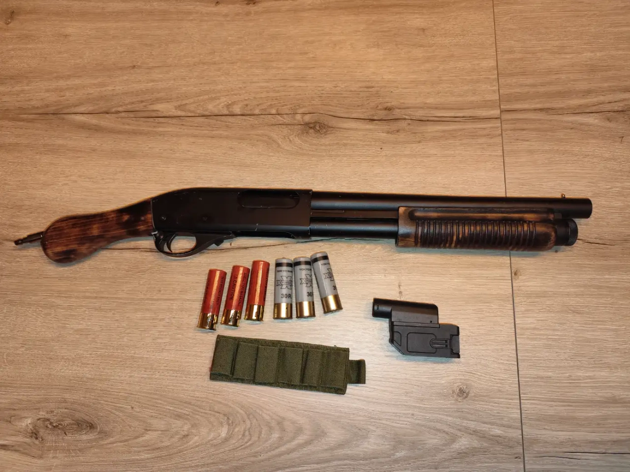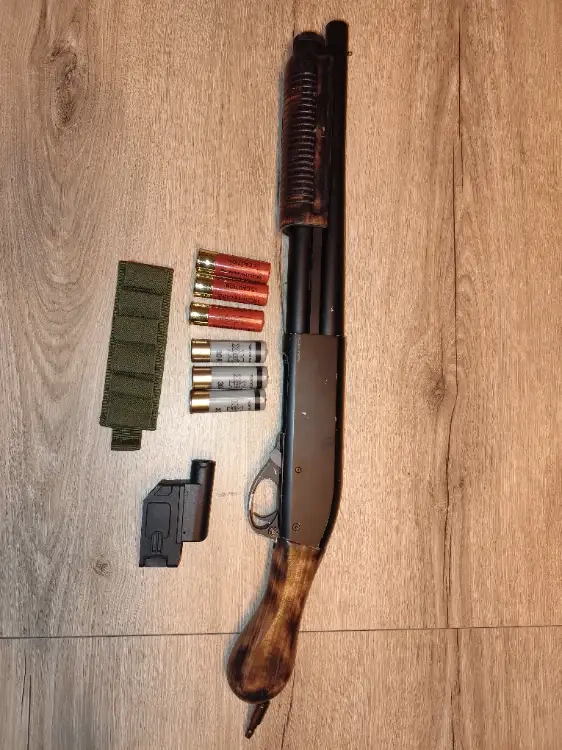 Bonjour je vend l'un de mes m870 golden eagle custom bois, passé en hPa, patine faite maison, vendue avec 6 cartouche dont 3 marui, et un adaptateur chargeur M4 , une bande velcro pour cartouche