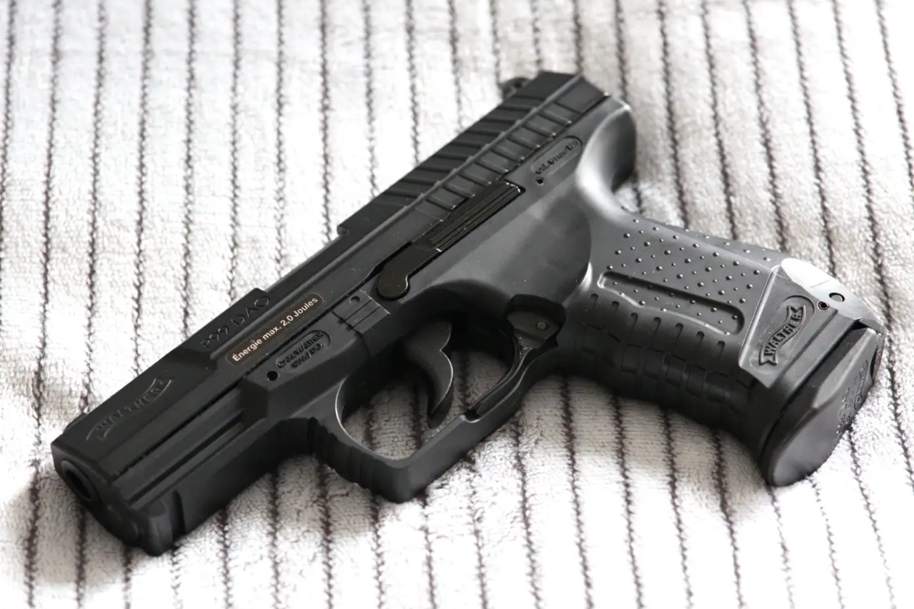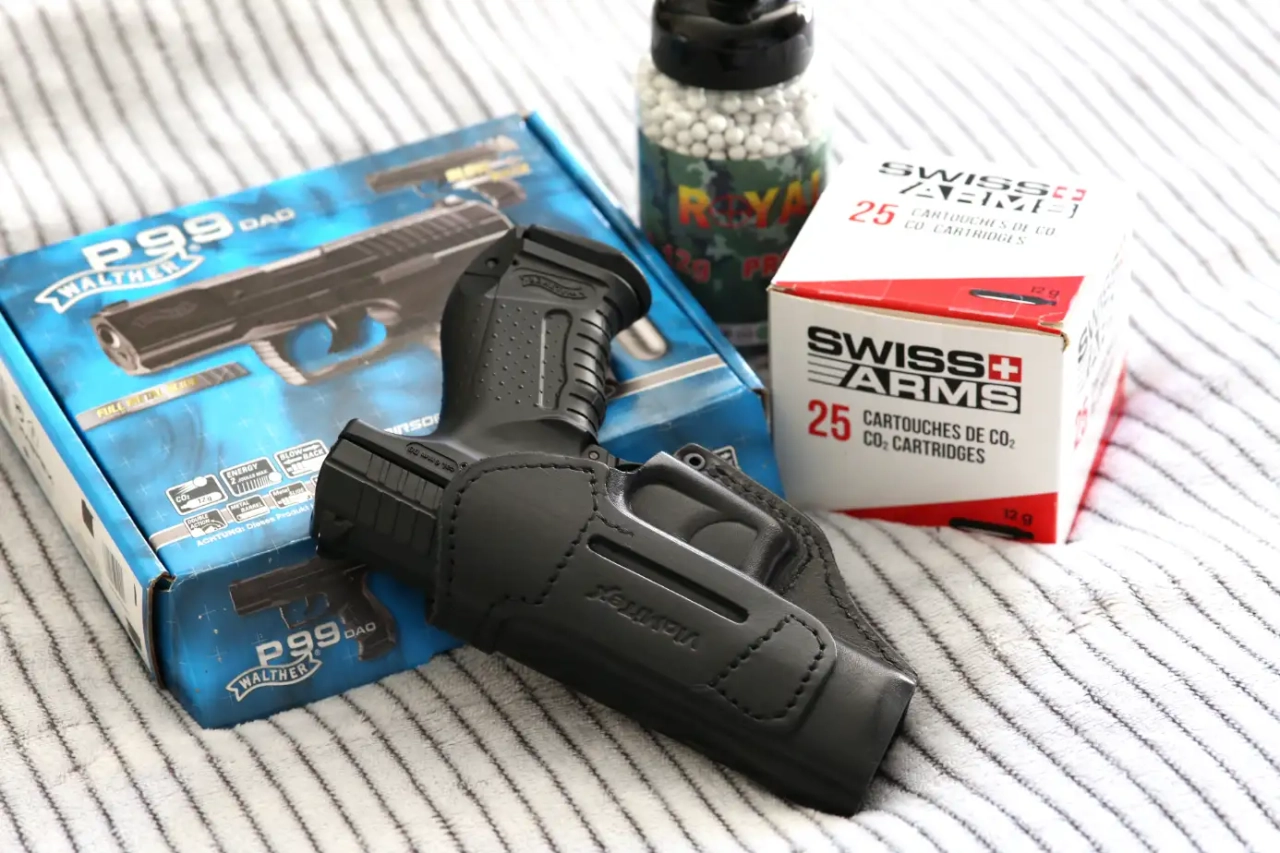 Ensemble airsoft : Pistolet Walther P99 DAO Co2 (2joules) catégorie D comme neuf (boite origine et notice) avec son étui ceinture Vlamitex cuir , un lot de cartouches Co2 SwissArms, un biberon de billes biodégradables. Vendu à une personne majeure uniquement.