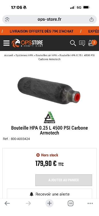 Bouteille HPA 0.25 L 4500 PSI Carbone Armotech