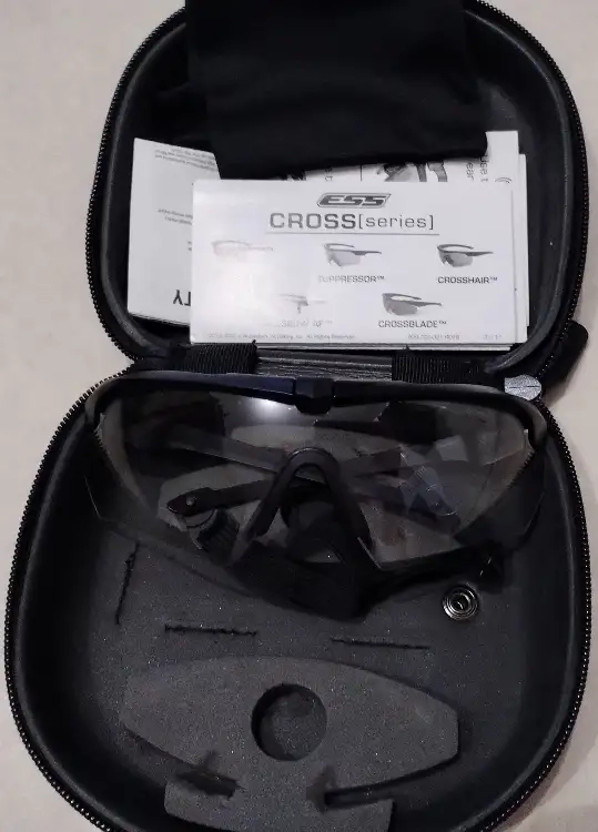 Lunettes de tir / balistique marque ESS Crossbow version supressor (branches plus fines pour permettre de porter plus confortablement un casque anti-bruit). Une seule paire, verre translucide. Matériel en très bon état, très peu voir pas utilisé. Vendu avec housse de transport, notice et lanière/sangle élastique de maintien.