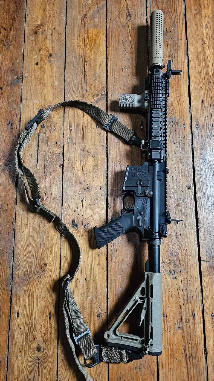 Elle est équipée d’une sangle, d’une poignée avant, d'un silencieux et d’une crosse Magpul. Je la laisse avec un chargeur et la boîte d’origine.