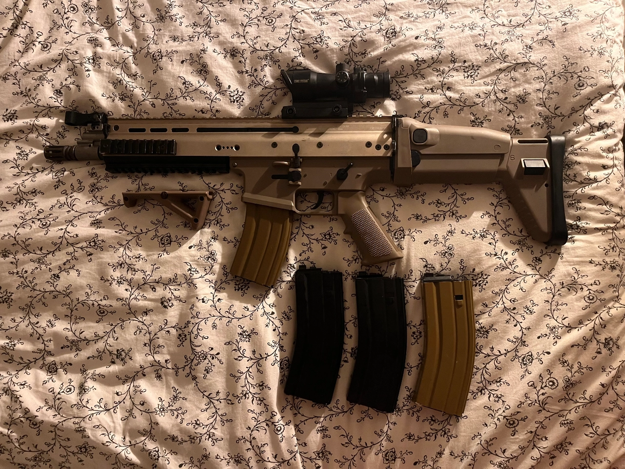 Je mets en vente ce magnifique SCAR L GBBR VFC sous licence FN Herstal ainsi que 4 chargeurs, 3 sans fuites et 1 Tan avec une légère fuite, un ACOG noir et une poignée triangulaire.