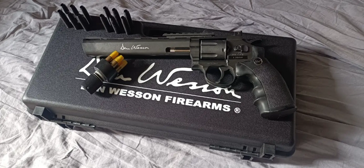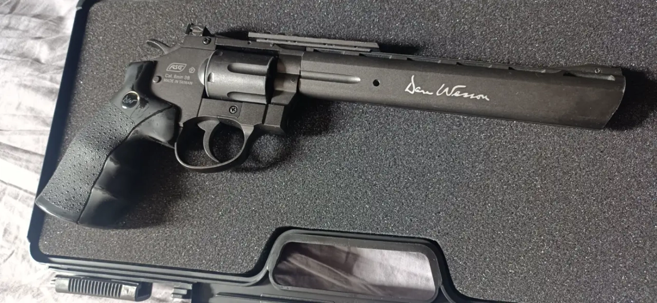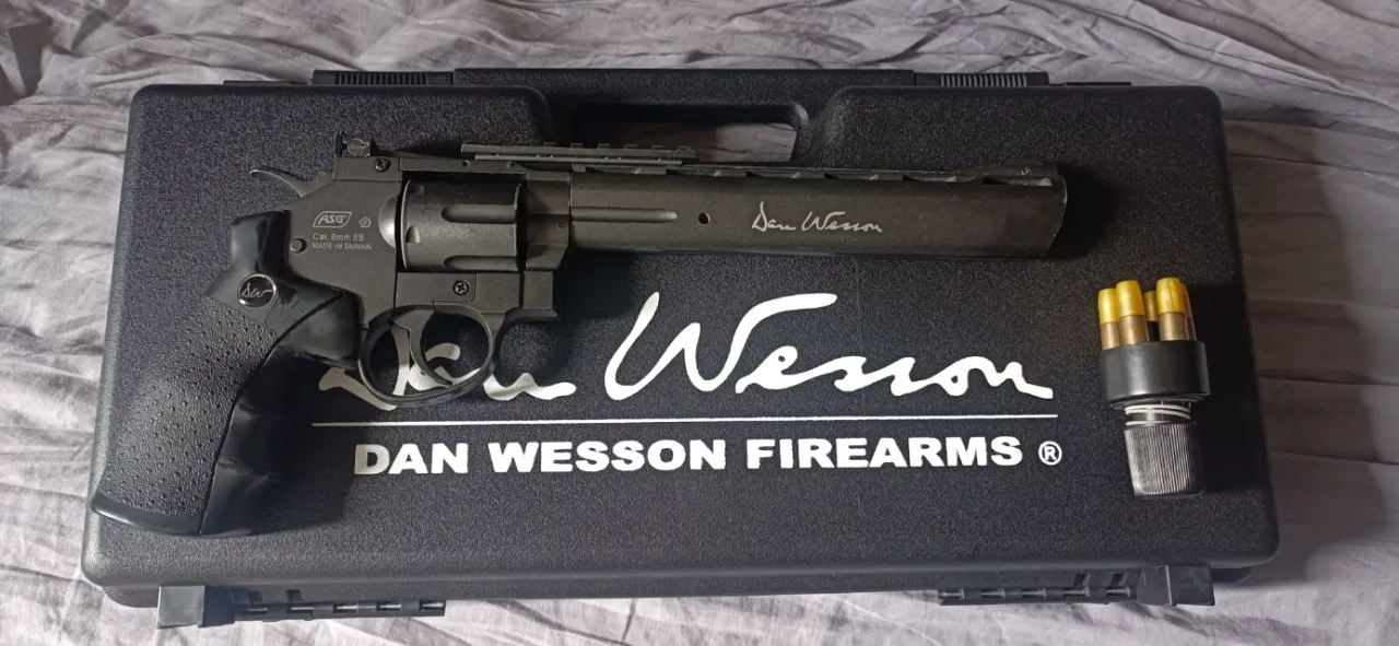 Revolver Dan Wesson de chez ASG entièrement en métal dans sa version noir mat avec canon de 8" pouces et sa plaquette de montage pour optique (peut-être retiré facilement)
