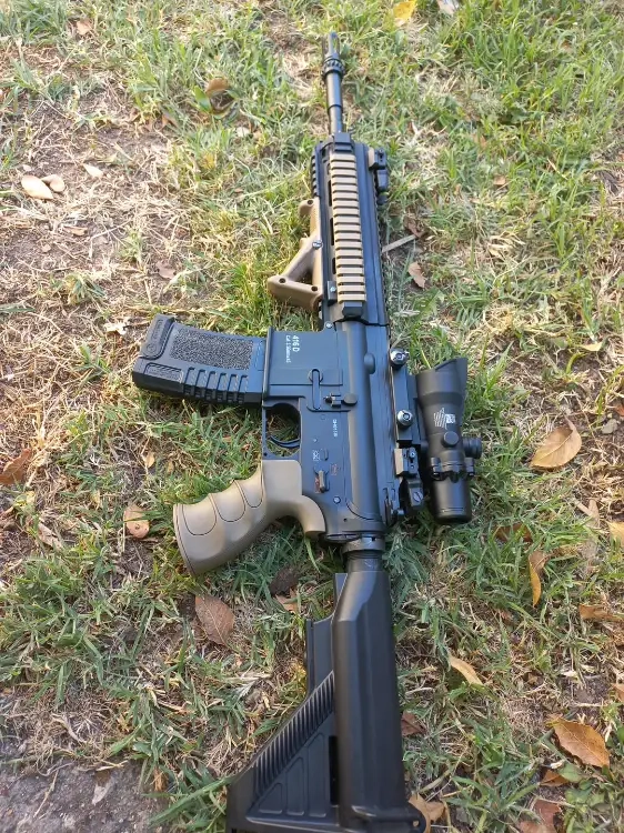 Vendu avec: lunette Trijicon ACOG 4x32 à fibre optique (150€ neuf), 3 chargeurs mid-cap 120coups amoeba.