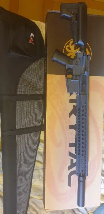 Vend une réplique AEG krytac LVOA-C de couleur combat grey peut utiliser a fait quelques parties deux petites parties limé a l'avant pour rentrer un Silencieux type RC2 SOCOM 556 Noir 14mm CCW 5KU avec sa Rallonge canon externe 2" 14mm CCW Next Generation Tokyo Marui Laylax vendu d'origine avec sa boîte et tous c'est accesoire plus housse et poignée verticale sur demande.