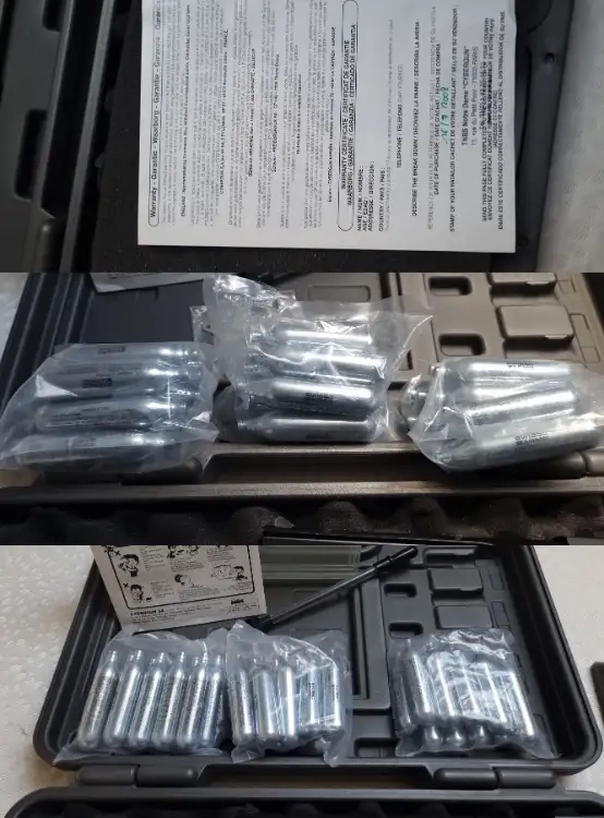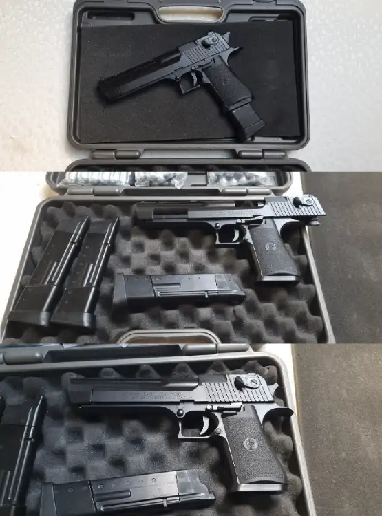 Réplique de Desert Eagle de chez Cybergun, vendue avec 3 chargeurs longs, 29 sparclettes de CO2 12gr Swiss Arms et sa mallette de transport.