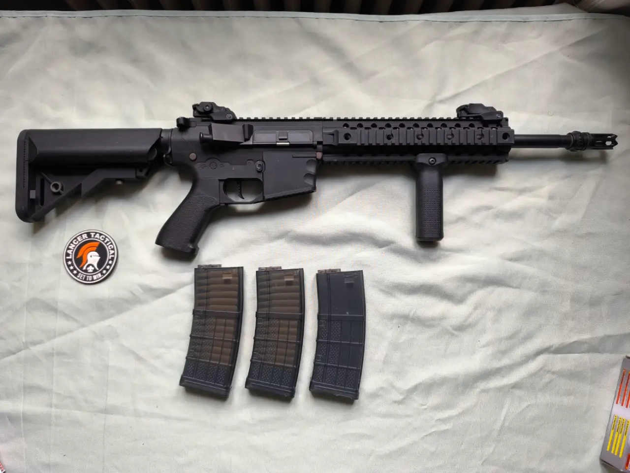 Vendu avec 5 batteries lipo 11.1, le réducteur de son escamotable, le frein de bouche d'origine, la poignée, 3 chargeurs hi-cap.