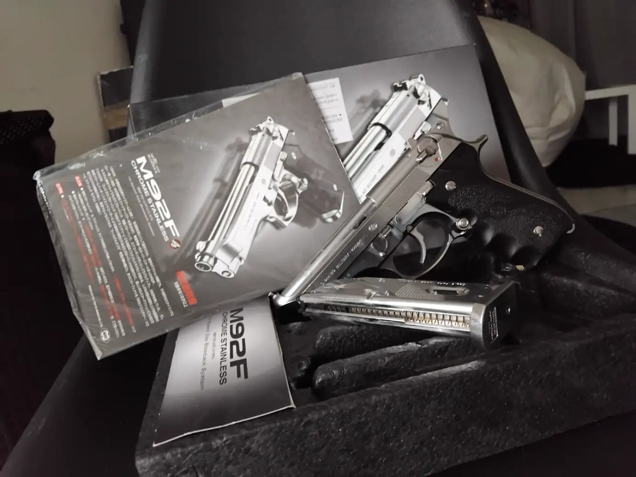 Je vend mon Berreta M92F chromé de la marque Tokyo Marui quo fonctionne nickel avec 2 petite craclure met rien de méchant avec son chargeur d'origine et sa boîte avec notice pas déballer + holster rigide noir.