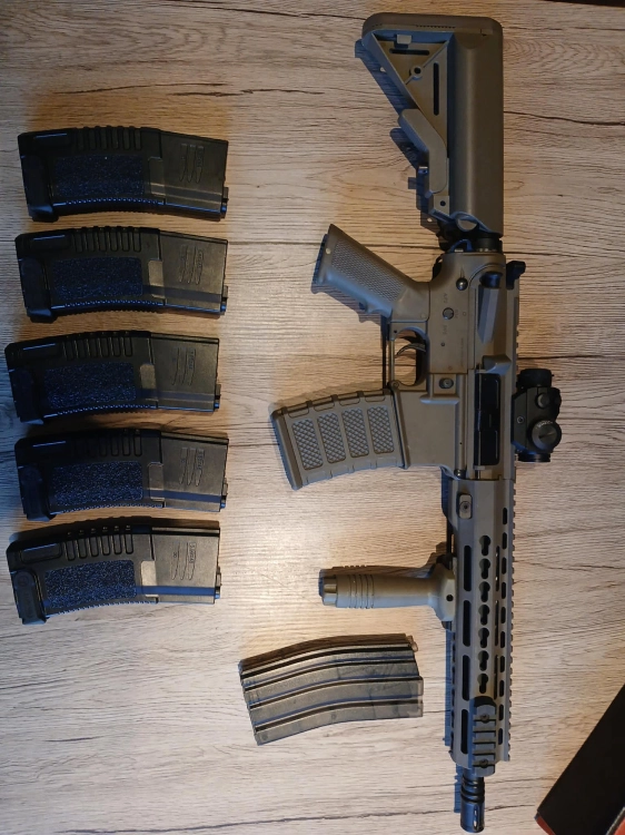 Vendue avec une poignée verticale standard + viseur red hot + babyloader + 5 chargeurs AMOEBA type M4 mid-cap