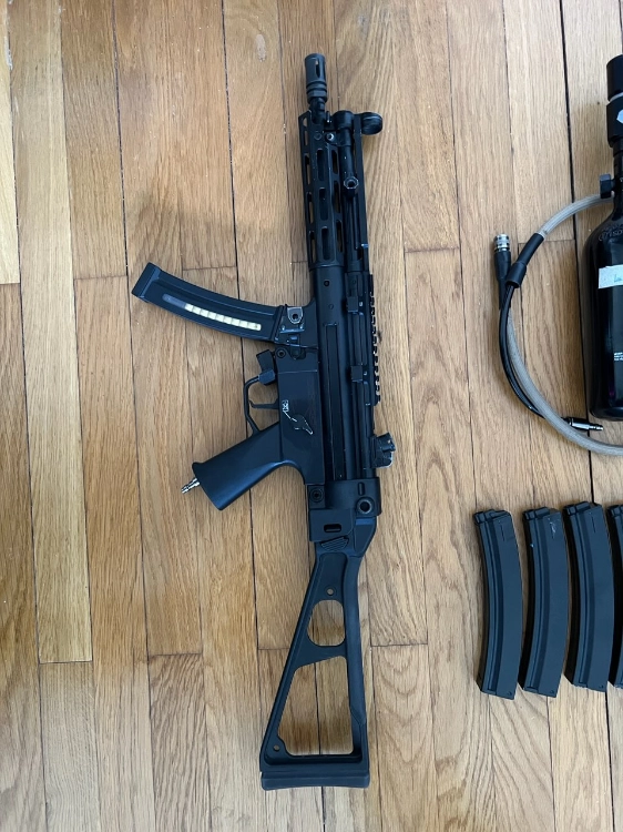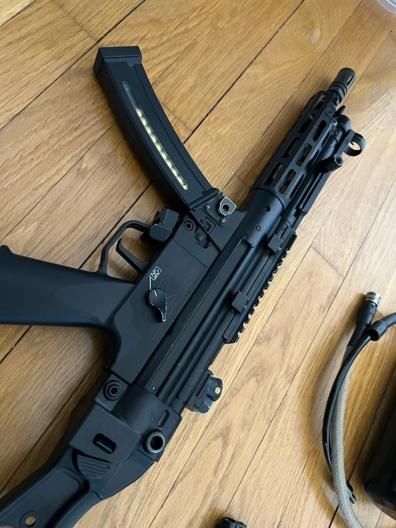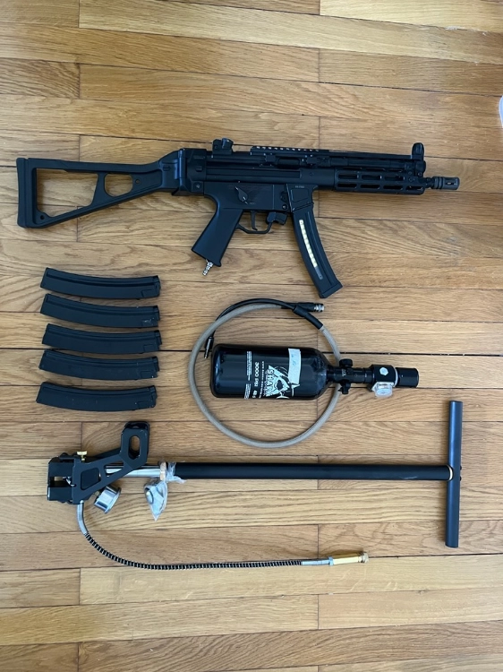 Mp5 cyma platinium avec module HPA Kythera vendu avec bouteille d’air comprimé et une pompe qui permet de la recharger.