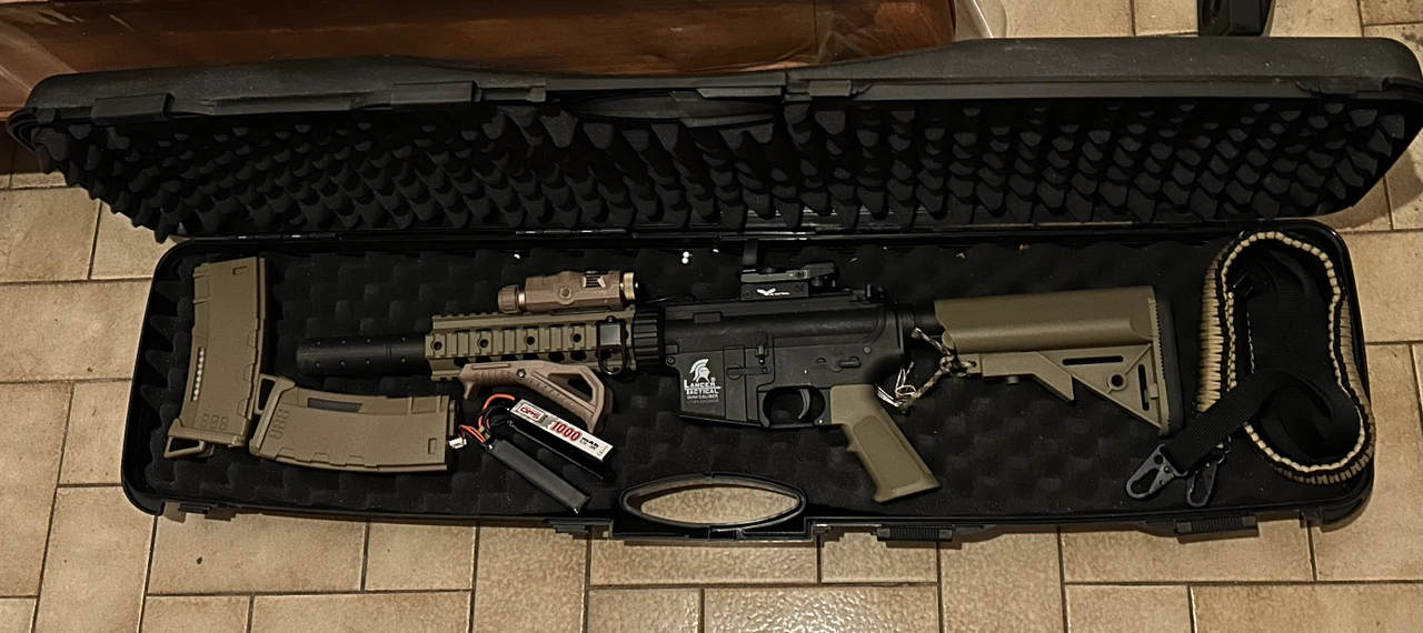 Réplique, viser holographique, boîtier type Pes-15 lampe et laser. Sangle et 2 chargeurs avec batterie comprise.